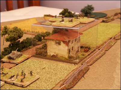German infantry and a Panther approach a ruined farm occupied by a British squad and HMG section (GHQ figures/tank, Timecast building, Woodland Scenics and homemade trees).