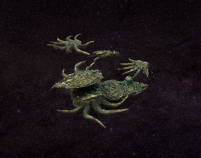 Force Purgatory engaged the broodship as best it could, with salvoes of missiles and disruptor beams, but very little significant damage was done on either the broodship or its escorts. Captain Wyatt Hole's 'Three Sheets' soon had only its point defence weapons operative. A ferocious attack from Spikey fighters and beam weapons took out all the major turrets of the 'Taking Umbrage', rendering it useless. Captain Knut Ronstar's 'Keel Hauler' was still putting up a strong fight, but the Spikey's seemed to have an inexhaustible supply of ships.